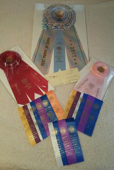| CONGRATULATIONS!! JERSEY, NOW GCH CRAJO'S JERSEY SHORE AT BIGLUV AND MARY ON YOUR SELECT WIN AND YOUR GRAND CHAMPIONSHIP TODAY AT THE COYOTE HILLS KC!!!!! WAY TO GO GIRLS :) |